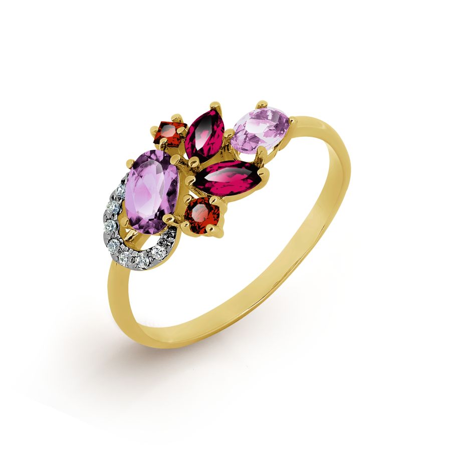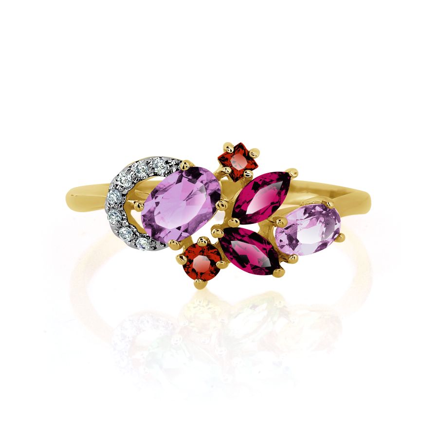 КОЛЬЦО С АМЕТИСТАМИ, ГРАНАТАМИ, РОДОЛИТАМИ И ФИАНИТАМИ