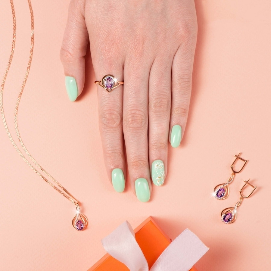 Вставка1 аметист 0,62ct 7,0*5,0 Груша ; 18 фианит 1,0 Круг